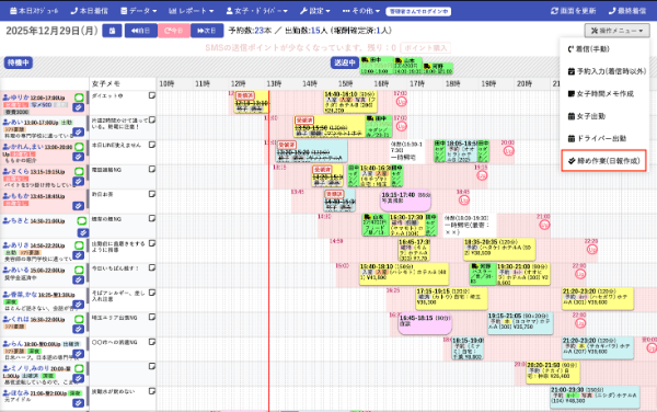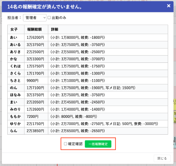今日の報酬を全員一括確定させる方法 CTI機能 2026.02.12 こんにちは。ナレッジフロースタッフです。 本日は「今日の報酬を全員一括確定させる」方法についてご紹介します。 ぜひ作業効率アップにお役立てください! 「今日の報酬を全員一括確定させる」方法は、 スケジュール画面の右側にある【操作メニュー】にカーソルを合わせ、 【操作メニュー】の中の一番下にある【締め作業(日報作成)】をクリック するとこのように全員分の今日の報酬が出てくるので、こちらで一括で報酬確定をすることができます。 ぜひ、お試しください!