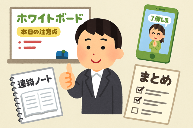スタッフとキャストの間でスムーズなやり取りを行うには、ちょっとした工夫が大切です。ここでは、現場で役立つ3つのコミュニケーションツール「ホワイトボード」「LINEスタンプ」「連絡ノート」を紹介します。