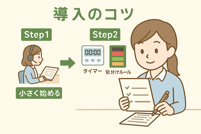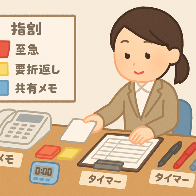 - 色ルールを掲示: 付箋・ペンの色意味を電話横に小さく貼る。