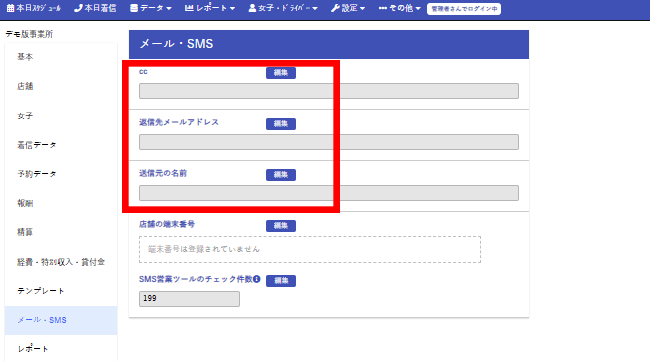 女子やドライバーに送信する連絡や、顧客に送信する営業・予約確認連絡のメッセージ文章テンプレートを設定します。